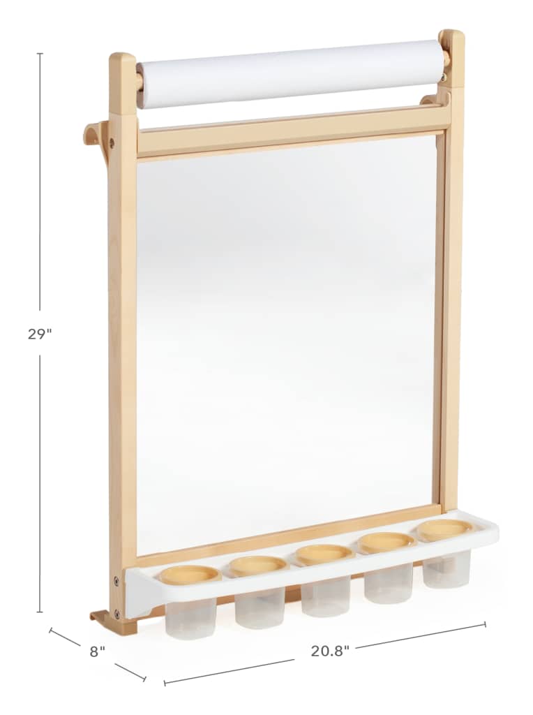 Support your child's creativity and imagination with an innovative easel and art display system. A see-through, easy-to-clean acrylic art board allows for collaborative play and seamless integration between sensory and art experiences. Mount and maneuver the easel from the side of the Sensory System Table and Canopy to a durable wall mount and back again with ease, encouraging creation whenever inspiration strikes. Comes complete with an acrylic art easel in a solid birch frame, a paper roll, an art tray with 5 paint cups, a plastic paper cutter, 2 display magnets, and a wall mounting system, making this the ultimate space saving, playful art solution. Easel with tray attached measures 20.75''W x8''D x 29"H. Combine with the Sensory System Table and Canopy (sold separately) and the Sensory System Tubes and Clips Set (sold separately) to create a unscripted, immersive opportunities for play, exploration and gross-motor activities. For ages 18 months and up.