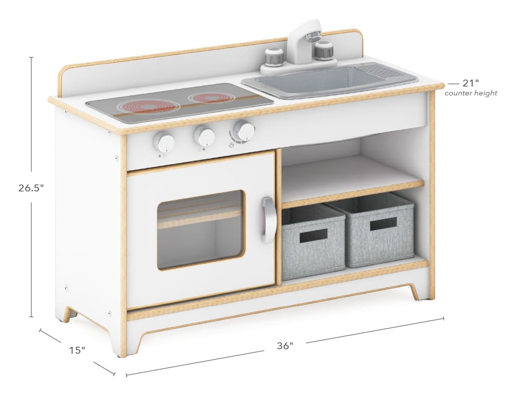 The EdQ Stove, Sink and Oven creates an engaging space for dramatic play with a design and features that feel both inviting and realistic. Children can step into the world of pretend play like cooking on the silver-toned stovetop with mirrored burners, turning interactive knobs, washing up at the sink using the faucet, or checking on pretend meals in the oven. The sink features a removable bin, adding another detail that makes pretend cleanup part of the play experience. This kids’ kitchen playset also includes interior shelves with two EdQ fabric bins that make it easy to store play food, utensils, or accessories, keeping the space organized for the next round of play. With its sturdy build and thoughtful details like a subtle tabletop overhang, this dramatic play kitchen set helps foster independence, creativity, and imaginative storytelling. Measures 36L x 15W x 26.5H.