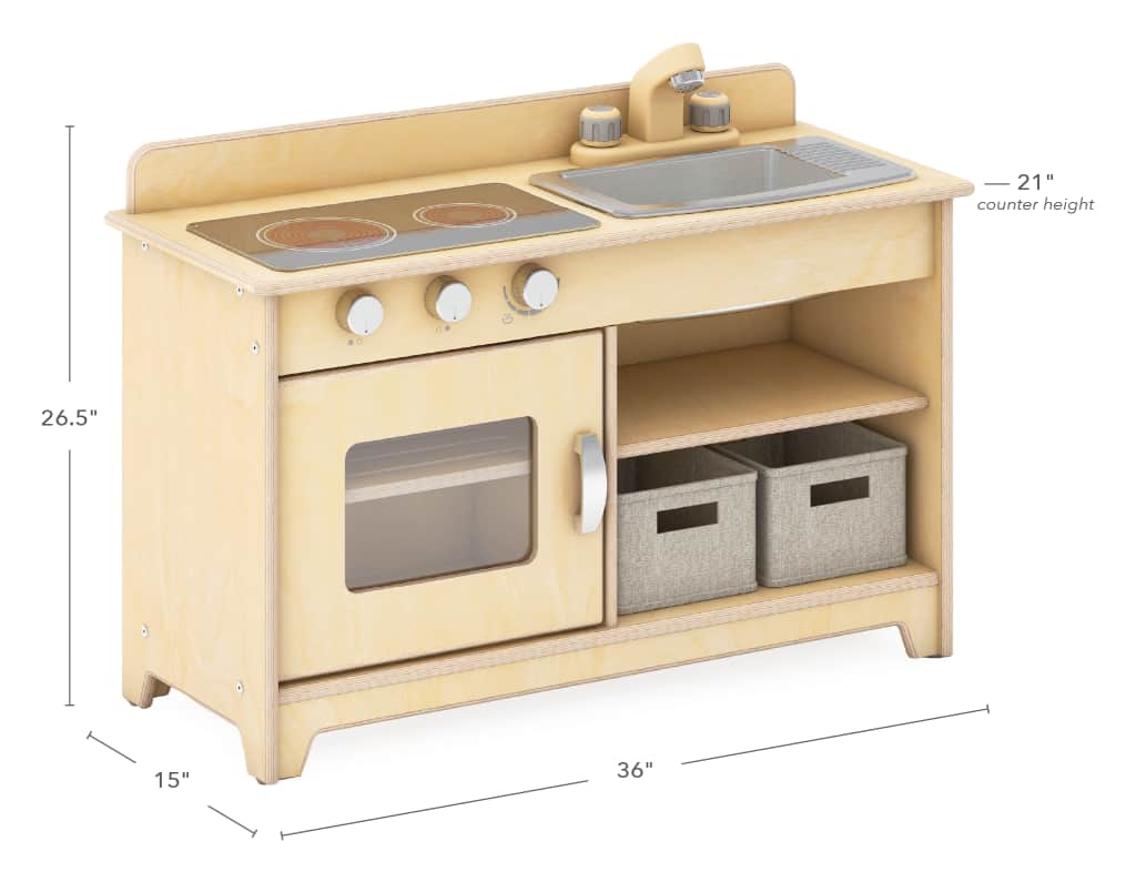 The EdQ Stove, Sink and Oven creates an engaging space for dramatic play with a design and features that feel both inviting and realistic. Children can step into the world of pretend play like cooking on the silver-toned stovetop with mirrored burners, turning interactive knobs, washing up at the sink using the faucet, or checking on pretend meals in the oven. The sink features a removable bin, adding another detail that makes pretend cleanup part of the play experience. This kids’ kitchen playset also includes interior shelves with two EdQ fabric bins that make it easy to store play food, utensils, or accessories, keeping the space organized for the next round of play. With its sturdy build and thoughtful details like a subtle tabletop overhang, this dramatic play kitchen set helps foster independence, creativity, and imaginative storytelling. Measures 36L x 15W x 26.5H.