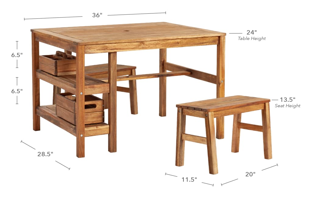Create an inspiring, organized outdoor environment where children can craft, explore, and connect with nature. The Martha Stewart Outdoor Craft Table is a beautifully designed acacia wood set that includes a spacious table, two coordinating benches, a divided wooden caddy, and an open crate for storing art and play materials. Ideal for home backyards, preschool gardens, or community learning spaces, this set supports meaningful outdoor activities while naturally withstanding seasons of sun, rain, and messy, hands-on play. The table features a slotted tabletop that prevents water pooling and built-in lower shelves neatly house the included crate and caddy. Both storage pieces have carry handles for portability and easy cleanup. The caddy’s divided sections help children organize their materials independently, a great way to build ownership of their space and tasks. Ergonomically designed benches provide comfortable, child-sized seating that promotes collaboration during creative sessions, group learning, or snack breaks. The benches slide smoothly under the table when not in use, helping keep spaces tidy. For added sun protection, the Martha Stewart Outdoor Umbrella (sold separately, G78203) is the perfect companion. Made from durable, UV-resistant polyester, it features a polished brass connector and fits securely into the tabletop’s central hole. A lower support built into the table helps stabilize the umbrella, even on breezy days. This set encourages children to explore open-ended play and hands-on learning in natural surroundings, nurturing creativity, connection, and a sense of agency in a shared outdoor space.