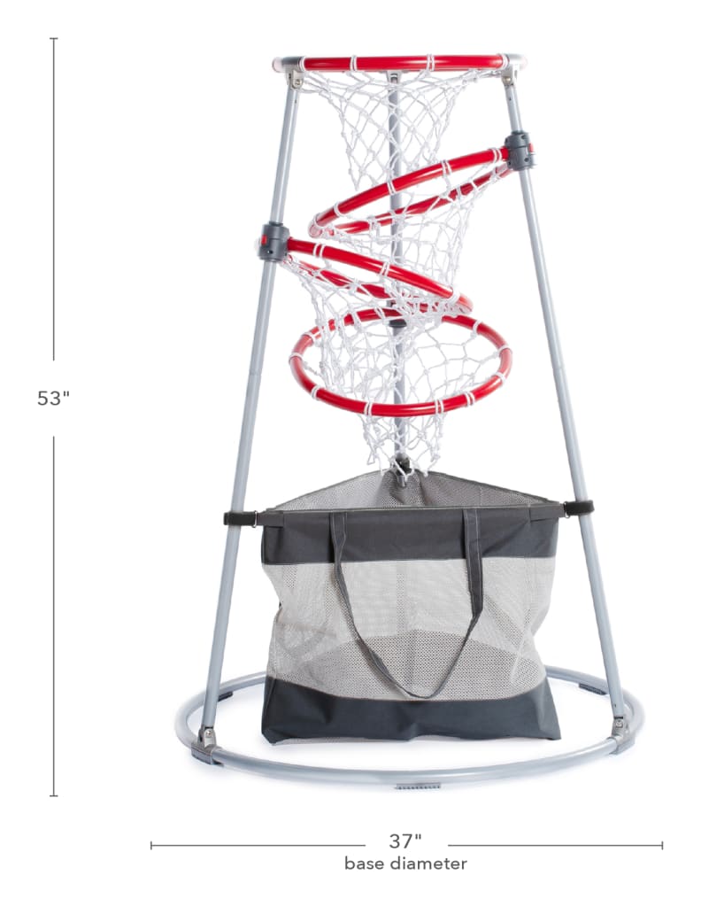 Promote gross motor activities and physical play with a 4-Hoop Basketball Play Set that can be used indoors or outdoors. Children 3 and up can engage in group play or individual play using the netted hoops arranged at different heights. Store basketballs (sold separately) in the included storage bag when not in use. Lowest hoop measures 33"H, highest hoop measures 53"H.