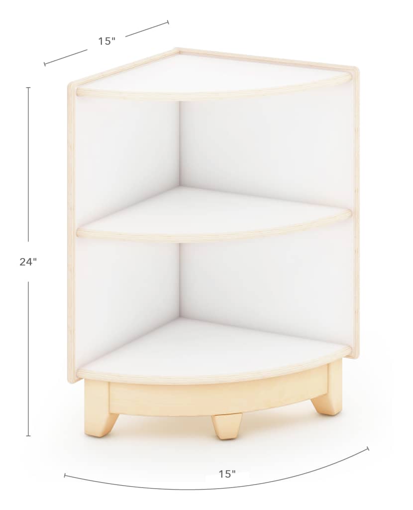 The Sense of Place 24" Corner Unit provides a unique corner storage solution. Use as a connecting piece with other Sense of Place furniture pieces to create a modular system within the classroom, or use alone to satisfy organizational needs in smaller learning environments. An easy-to-clean combination of birch plywood, white laminate plywood and birch solids make this open shelving unit the perfect neutral backdrop to highlight and store classroom materials, found objects and art projects. Designed to be used by children ages 3 and up. Measures 15"W x 15"D x 24"H.